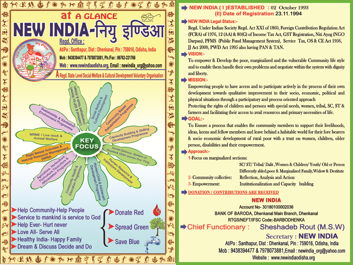 NEW INDIA is a State level Social Welfare & Cultural Development Civil Society Organization